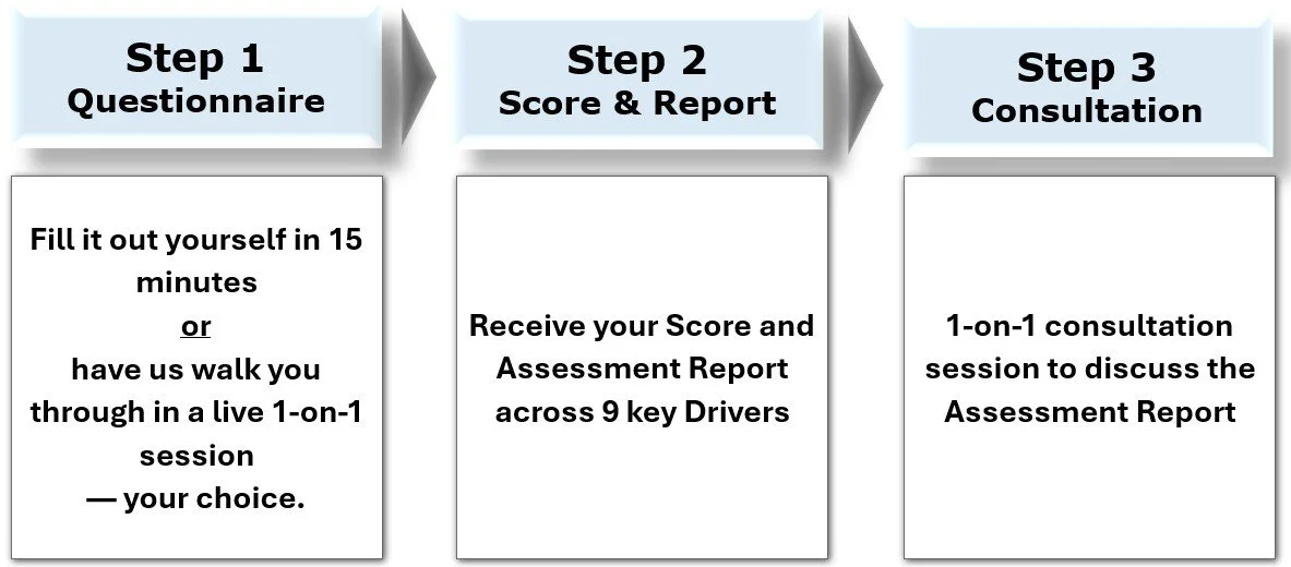 Our fast, free assessment provides a readiness score and a snapshot of your company's health across nine (9) key drivers of enterprise value.